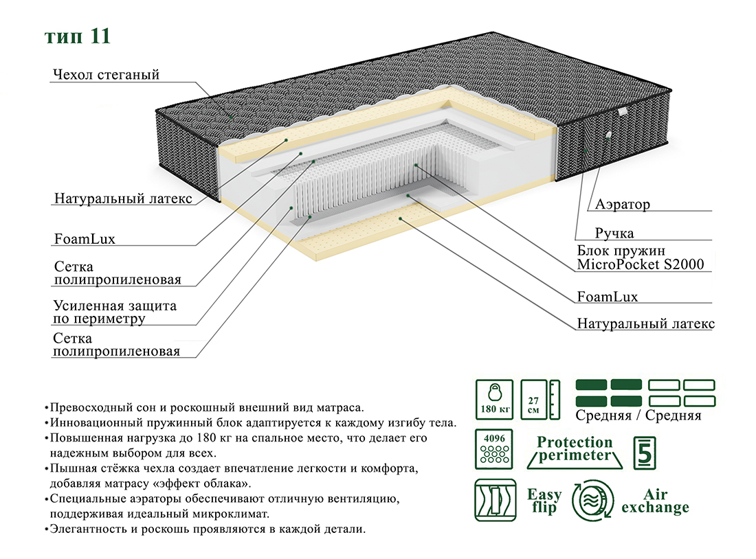 - Матрас оснащен инновационным пружинным блоком MicroPocket S2000 с 1024 пружинами на квадратный метр. Этот блок не только подстраивается под ваши контуры, но и реагирует на каждое движение, обеспечивая идеальную поддержку. С нагрузкой до 180 кг на спальное место.
